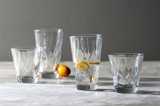 Deze elegante glazen zijn echter niet alleen geschikt voor dagelijks gebruik maar zullen ook bij nette diners niet misstaan. De inhoud van dit glas is 320 ml en het is daarmee ideaal voor water en frisdranken, maar kan ook goed gebruikt worden bij andere gelegenheden, zoals whisky met ijs.