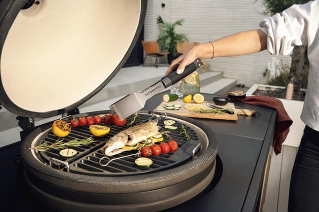 Deze Big Green Egg Half Moon ConvEGGtore stone in de maat medium is is zeer veelzijdig. Je bedekt het rooster van je Big Green Egg voor de helft waardoor je tegelijkertijd indirect kunt bakken/ slow cooken en op de andere helft grillen. Bij gebruik van 2 halve ConvEGGtor stenen creëer je een volledige indirecte zone en heb je de standaard ConvEGGtor niet meer nodig.