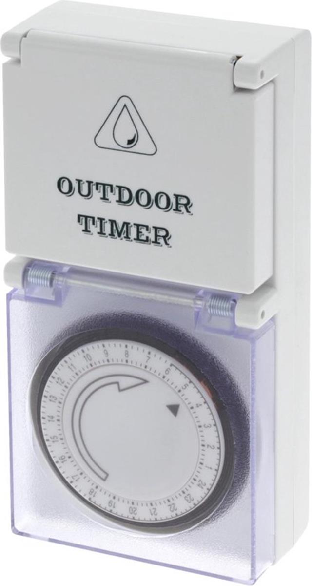 Spatwaterdicht. Met dagprogramma, vaste ruiters. Per dag 48 schakelmomenten mogelijk. Kleinste schakeltijd 30 minuten. Maximaal 16 Amp. (3680 Watt). Met kinderbeveiliging. Let op: Niet geschikt voor Type E stopcontact (België)