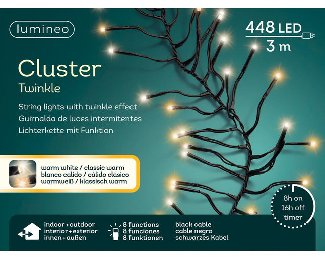 Deze Lumineo LED Clusterverlichting is geschikt voor zowel het gebruik binnen als buiten. De verlichting heeft een zwarte kabel, geeft klassiek warm licht en bevat 588 LED lampjes. De afstand van het eerste tot het laatste lampje is 4,5 meter en de totale lengte (inclusief kabel van 5 meter) is 9,5 meter. Daarnaast beschikt deze verlichting over een timer van 8 uur, een 5F dimmer en werkt met een trafo.