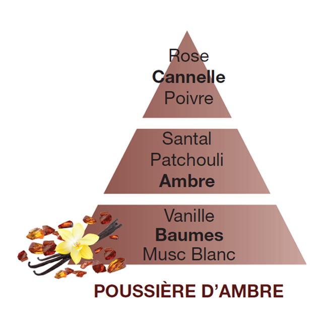 Poussière d’Ambre is een zeer sensueel huisparfum dat uw interieur zal hullen in een zeer warme en hartelijke sfeer. De kruidige geur verfraait de elegantie van de roos en de zinnelijke schoonheid van grijze amber doet het sandelhout en de patchouli nog beter uitkomen. Een voile van witte muskus omhult vervolgens de basisnoot van balsem en vanille. Topnoten: Roos, Kaneel, Peper Hartnoten: Sandelhout, Patchouli, Amber Basisnoten: Vanille, Balsems, Witte muskus