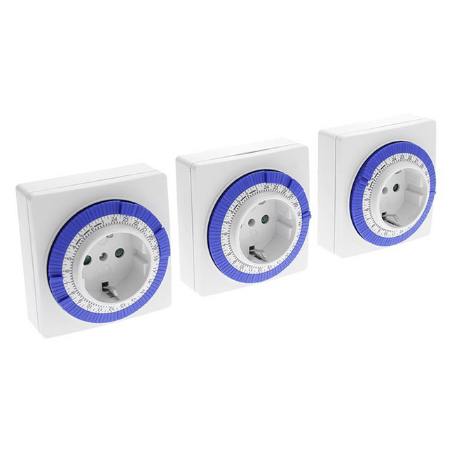 Q-link tijdschakelklok analoog 3 stuks. Met dagprogramma, vaste ruiters. Per dag 96 schakelmomenten mogelijk. Kleinste schakeltijd 15 minuten. Maximaal 16 amp. (3680 watt). Met kinderbeveiliging.