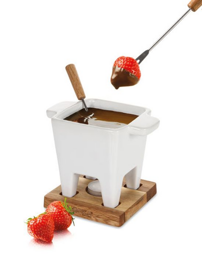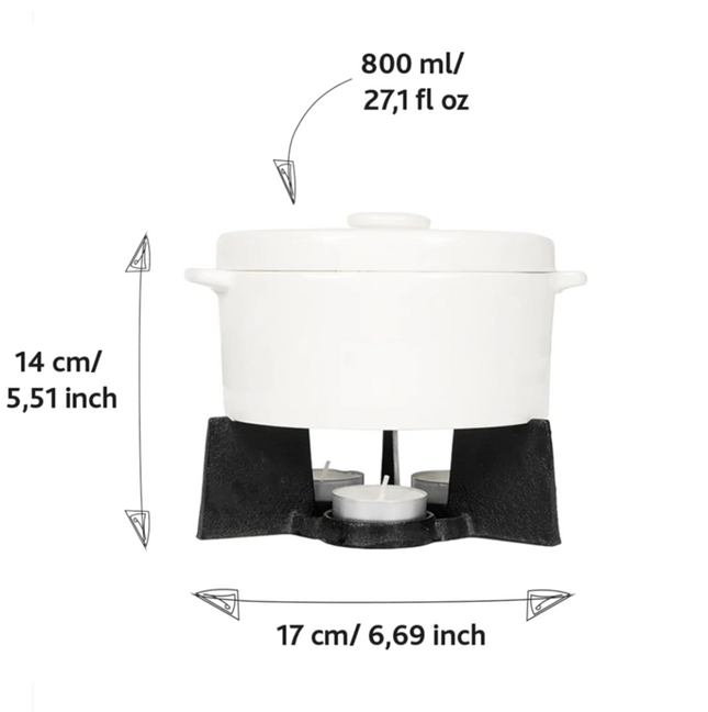 Deze Tapas Kaasfondueset is van het merk Boska. Het bestaat uit een klein fonduepannetje, gemaakt van aardewerk, dat bijzonder goed geschikt is voor kleine hapjes. Met een waxinelichtje onder de fonduepan houd je de gesmolte kaas op de juiste temperatuur. Het onderstel is gemaakt van mahoniehout. Bij deze kaasfondue krijg je 2 vorkjes en een waxinelichtje. De inhoud van het pannetje is 200 gram.