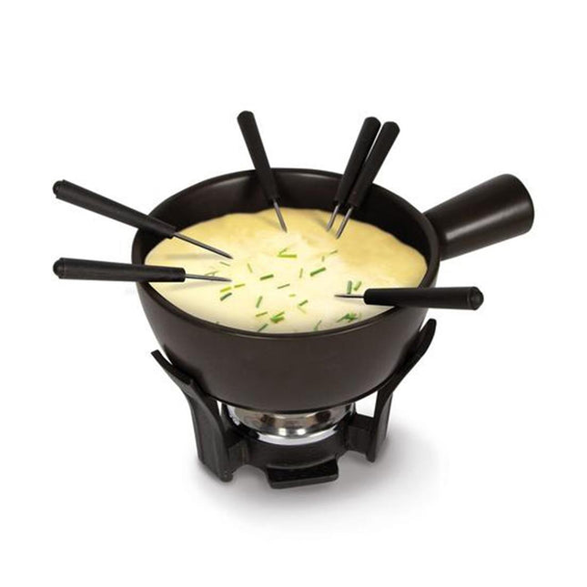 Deze fondueset is van het merk Boska. In de fonduepan van aardewerk smelt de kaas langzaam, zonder dat deze verbrand. Hierdoor krijg je een heerlijke romige kaassaus die niet aan de fonduepan plakt. Met wat voor een kaas je ook wil fonduen, deze pan is er geschikt voor. Verder bevat deze set een onderstel en een brander. Tot slot krijg je er 6 fonduevorken bij. Let op! bij eerste keer gebruik is het zeer aan te raden om de pan 2.5 uur onder te dompelen in water, gezien dan het Keramiek goed kan uitharden. Na gebruik kunnen de vorken en de pan zo de vaatwasser in.