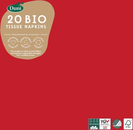 Handig servetformaat voor informele toepassingen. De functionele keuze. Geschikt voor ontbijt, lunch, tussendoortje en thee- of koffiepauzes. Hoe meer lagen, hoe sterker.  Specificaties Merk Duni  EAN 7321011058044 Afmeting 33 x 33 cm Aantal lagen 3-laags Inhoud verpakking 20 stuks