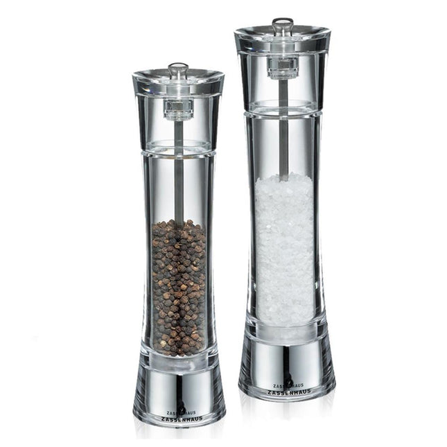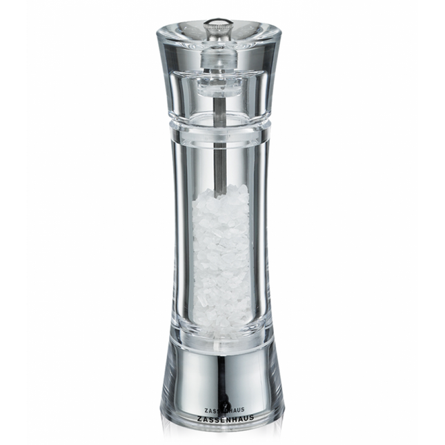Deze stijlvolle Zassenhaus Aachen zoutmolen is 18 cm hoog en is gemaakt van transparant acryl. Het keramische maalwerk is aan de onderzijde traploos verstelbaar van zeer fijn tot zeer grof. Het zandloper figuur geeft de molen een extra luxe uitstraling. Ook handig: door het gebruik van transparant acryl kan je goed zien wanneer je de molen moet bijvullen. Dat maakt de molen niet alleen erg stijlvol, maar natuurlijk ook praktisch. Ontdek alle peper- en zoutmolens of het gehele Zassenhaus assortiment in onze webshop.