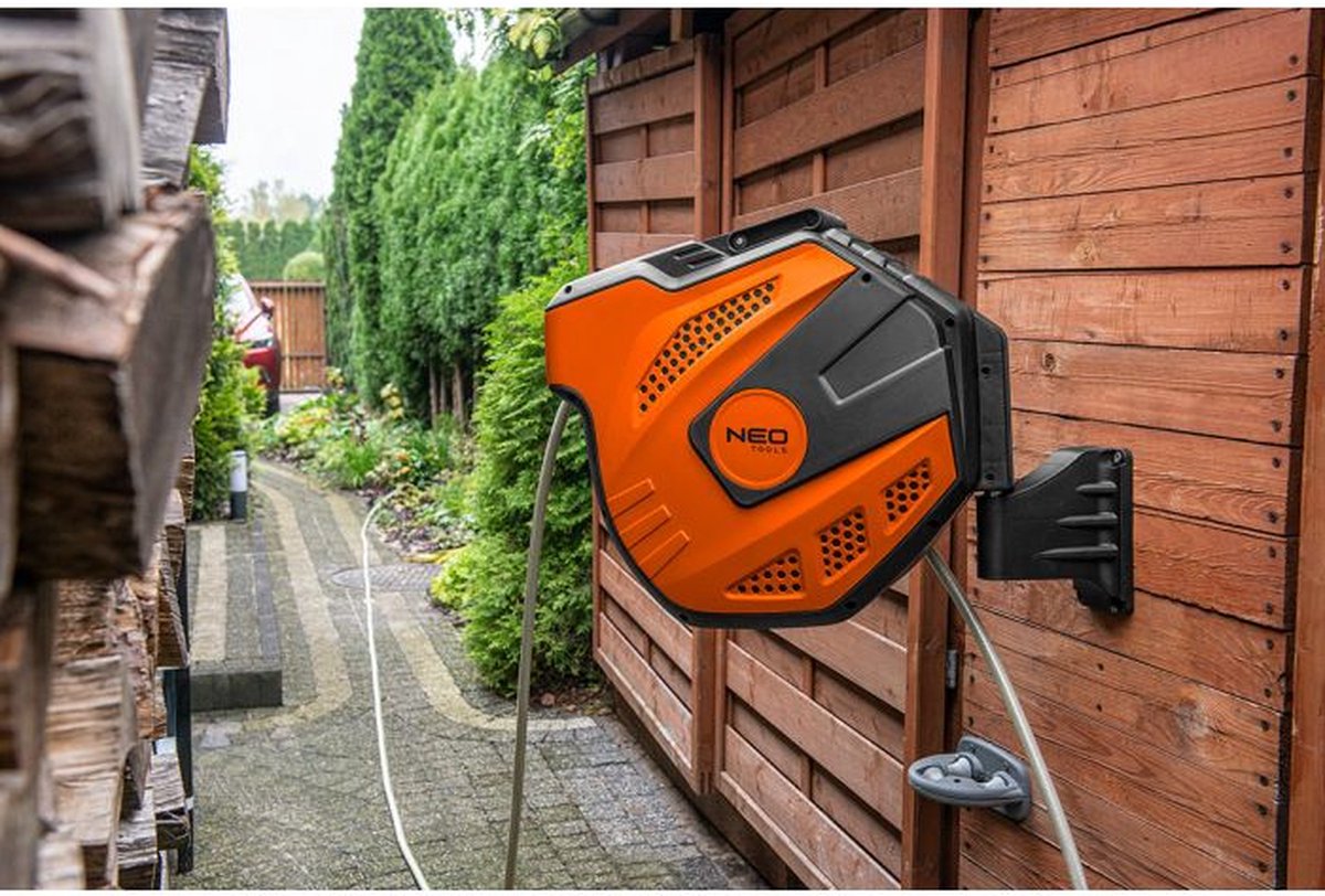 De NEO TOOLS Automatische Slanghaspel biedt ultiem gemak voor tuin- en schoonmaakklussen. Met een 20 meter lange slang en extra 2 meter aansluitslang is dit een complete set met automatische haspel, sproeier, tapaansluiting en connectoren. Het slimme oprolsysteem met remmechanisme voorkomt ongecontroleerde stops en biedt de mogelijkheid om de slang op elke gewenste lengte te vergrendelen. Gemaakt van hoogwaardig plastic met een dubbele behuizing voor duurzaamheid. Handig te monteren aan de muur met een 180-graden bewegingsbereik. Maak water geven, autowassen en terrasreiniging eenvoudig met de NEO TOOLS Automatische Slanghaspel.