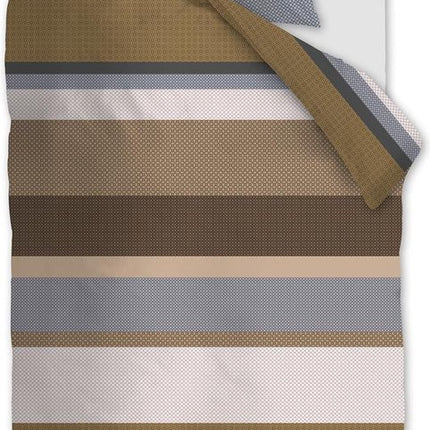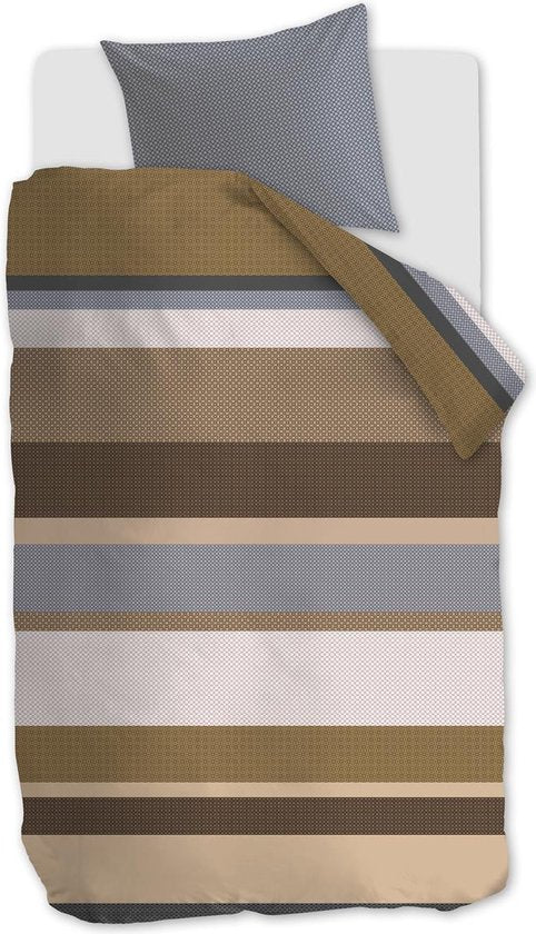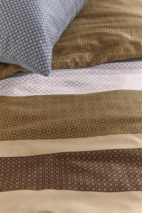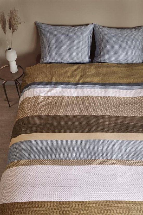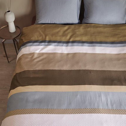 Dekbedovertrek Ines van Beddinghouse is een banendesign opgebouwd uit stofstructuren en fijne geometrische motieven. De kleuren bruin, grijs, zand, zalm, terra en ecru wisselen elkaar af. Het dekbedovertrek heeft een chique glans door de satijnweving.