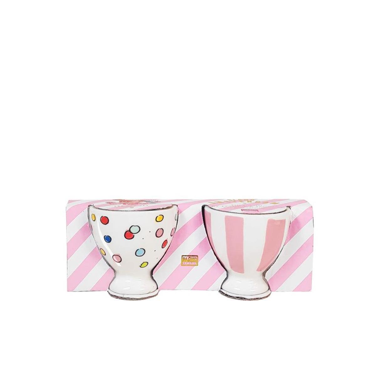 Met deze set van twee eierdopjes uit de Even Bijkletsen serie van Blond Amsterdam wordt het serveren van een eitje nóg leuker! De ene eierdop heeft een vrolijk confetti pintje en de andere roze strepen. Je kunt deze eierdoppen perfect combineren met de rest van het Blond Amsterdam servies. Of ontdek alle eierdopjes in onze webshop.