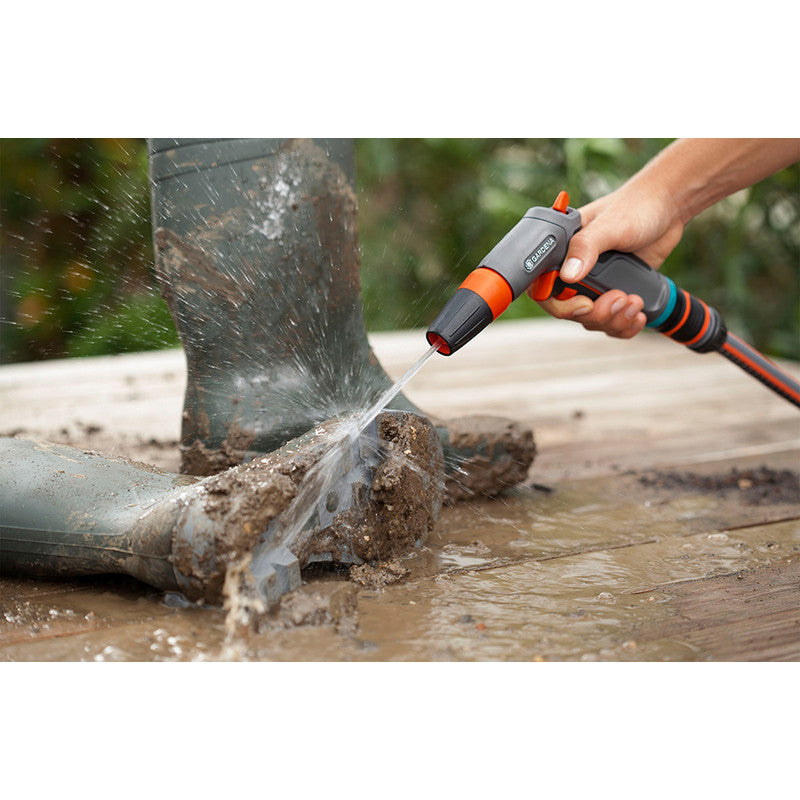 De GARDENA Comfort Spuitpistool is geschikt voor zowel reinigen als bewateren. De waterstraal kan variabel worden ingesteld van volle straal tot een fijne nevel. De ergonomische handgreep met zachte kunststof componenten zorgt voor optimaal bedieningscomfort tijdens het gebruik. De waterstroom kan bovendien traploos worden ingesteld. Voor continu gebruik kan de impulshendel worden vastgezet. De Comfort Spuitpistool beschikt bovendien over geïntegreerde bescherming tegen vorst.