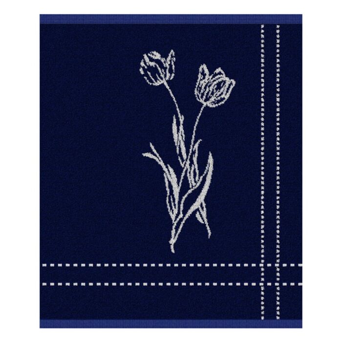 De DDDDD Lisse handdoek is vervaardigd uit 100% katoen. De donkerblauwe handdoek is voorzien van een afbeelding van tulpen. De doek is 55 cm lang en 50 cm breed.