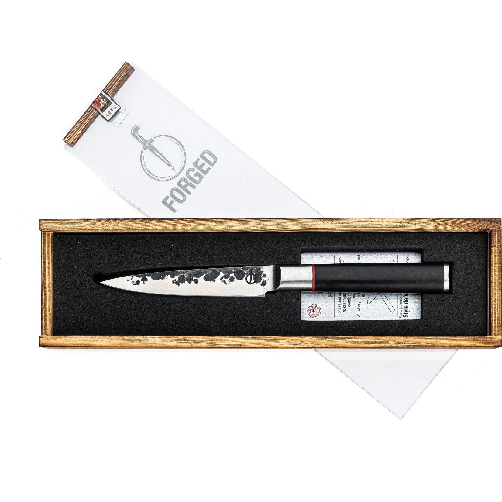 Het Forged Sebra Universeel mes is de kleine variant van het koksmes. Ideaal om groenten of kleinere stukken vlees mee te snijden. Dankzij het smalle lemmet kun je er zeer nauwkeurig mee werken. De Forged Sebra messen zijn vervaardigd van Japans 440C staal met een hardheid van 58 Rockwell. Alle Forged messen zijn met de hand gesmeed, hebben een lemmetdikte van 2 mm en een snijhoek van 18 graden. Verpakt in een luxe houten kistje. Met een garantie van 10 jaar.