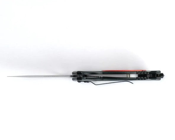 Voor de vergrendeling van het lemmet is een linerlock aanwezig met het "QuickSafe"-systeem. Dit betekent dat je het lemmet met één hand kunt in- en uitklappen en heb je je andere hand vrij. Daarnaast is het mes voorzien van een fraai handvat die gemaakt is van zwart aluminium met opvallende rode accenten op de voorzijde. Op de achterzijde van het handvat zit een clip.