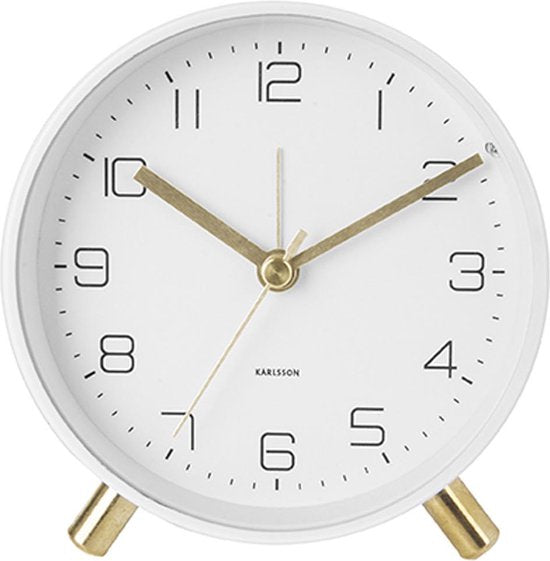 De strakke Karlsson Lofty tafelklok staat stevig en stijlvol op zijn gouden pootjes. Hij heeft een duidelijke tijdsaanduiding. Dankzij de alarmfunctie is dit klokje ook te gebruiken als wekker.