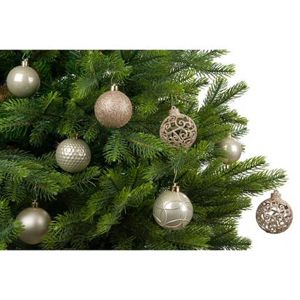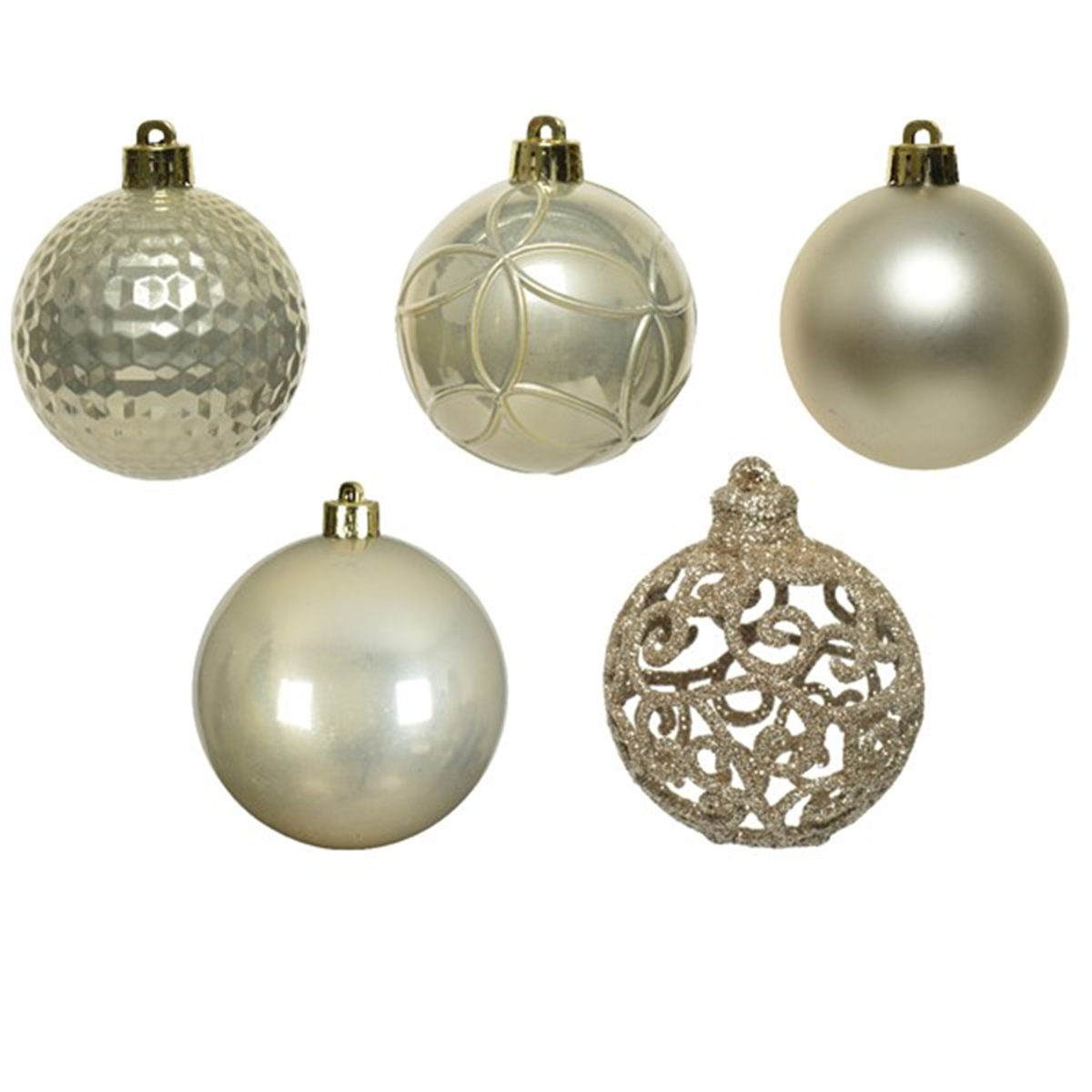 In deze box zitten 37 prachtige kerstballen in een mooie parelmoer kleur en hebben een afmeting van 6 cm. De inhoud van deze box bestaat uit een mix van diverse structuren waaronder glans en mat.