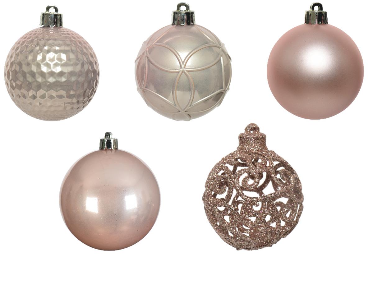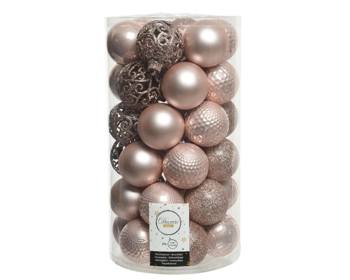 Kerstballen kunststof mix koker 37 stuks - Ø6cm - matt shiny glitter mix poeder roze