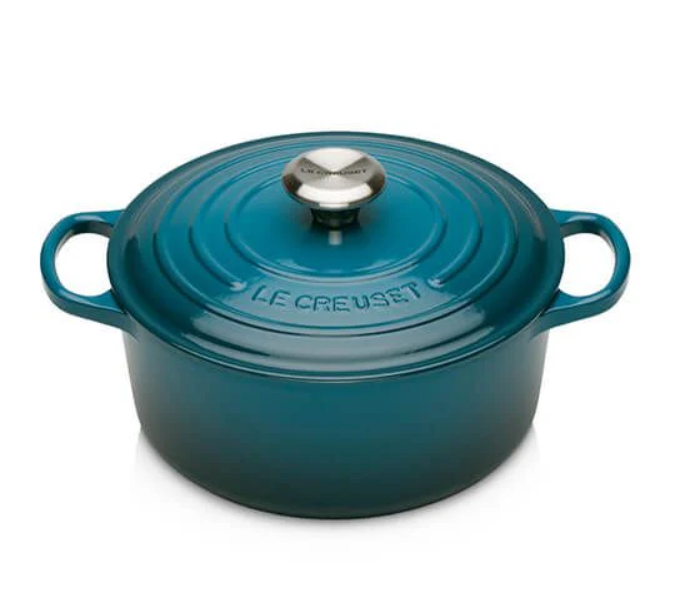 Deze iconische pan van Le Creuset heet niet voor niks de Signature braad-/stoofpan! De Signature pan heeft een deep teal kleur, is gemaakt van gietijzer en is perfect ontworpen voor stoofschotels, gebraden vlees, soep, ovenschotels én zelfs om te bakken. De ronde pan van geëmailleerd gietijzer heeft een diameter van 24 cm en een inhoud van 4,2 liter. Gietijzer houdt warmte vast en zorgt voor een gelijkmatige warmteverdeling zodat u perfect kunt bakken en braden. Daarnaast zorgt de nauwsluitende deksel ervoor dat het vochtgehalte precies goed is. De hittebestendige knop (tot 250°C) blijft koel en is ontworpen om u een betere grip te geven, zelfs wanneer u ovenhandschoenen gebruikt om het deksel op te tillen. Dankzij de grote handgrepen kunt u de pan gemakkelijk én veilig verplaatsen.