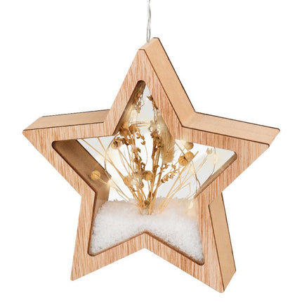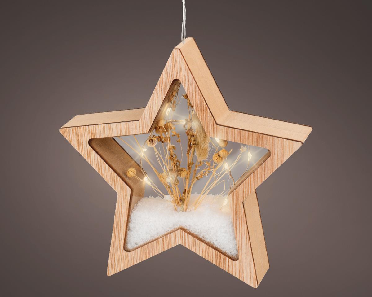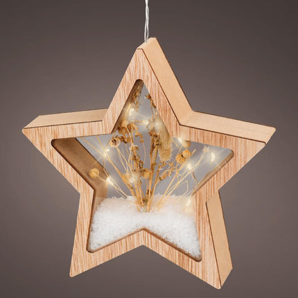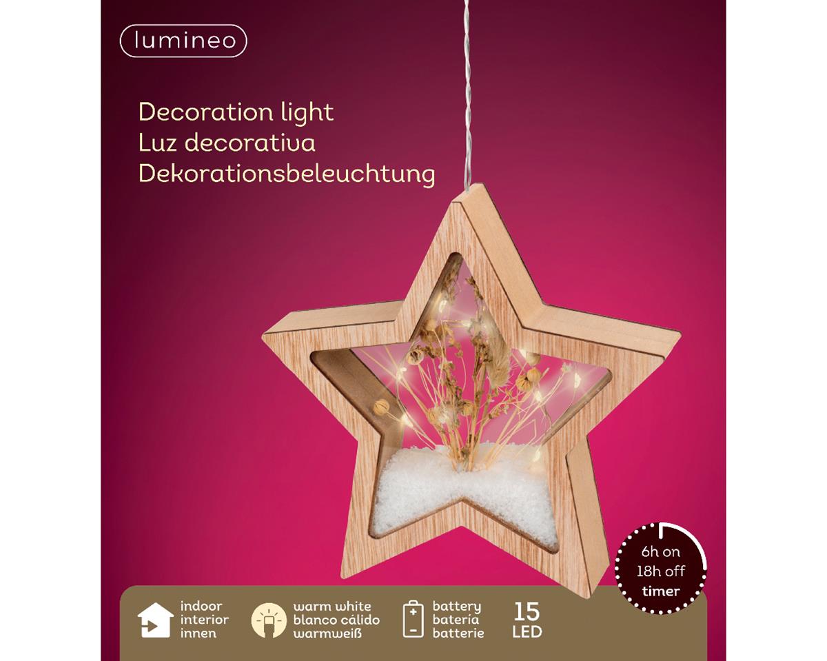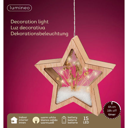 Deze stijlvolle Lumineo LED houten ster is gemaakt van naturel kleurig triplex en heeft een hoogte van 18 cm. De 15 LED lampjes geven warm wit licht en werken op batterijen (excl. 2x AA). Met de handige 6 uurs functie kan je de ster automatisch aan en uit laten schakelen. De ster is gevuld met een laagje sneeuw en droogbloemen en kan gemakkelijk worden opgehangen voor extra kerstsfeer.