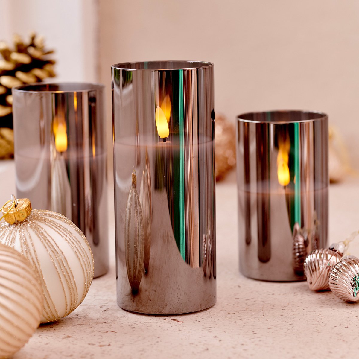 Lumineo LED stompkaarsen in glas. Betreed een wereld van schoonheid en rust met deze set van 3x stuks luxe LED kaarsen in glas. Elk van deze prachtig vormgegeven kaarsen straalt een warme en uitnodigende gloed uit, waardoor een sfeer van elegantie en ontspanning wordt afgegeven in elke ruimte. Het rookgrijze glas voegt een vleugje verfijning toe, terwijl het warme witte LED licht een kalmerende ambiance biedt die perfect is voor momenten van rust en contemplatie. Met een diameter van 7,5 cm en verschillende hoogtes hebben deze kaarsen een indrukwekkende aanwezigheid die elk decor verrijkt.