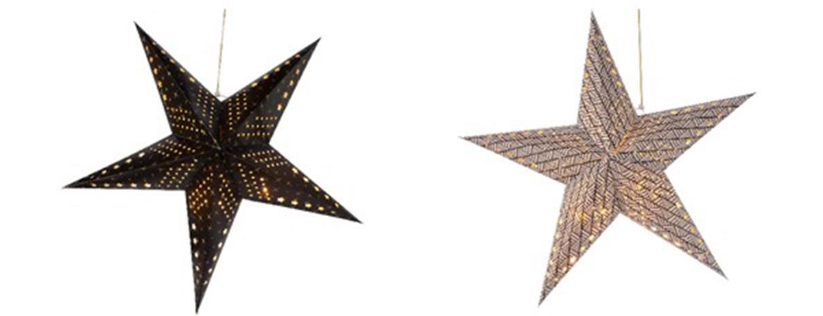 Breng extra sfeer in huis met deze leuke LED ster van papier. Verkrijgbaar in vier verschillende prints met goud, zwart of wit. De sterren worden per stuk verkocht. De omtrek afmeting van de ster is 60 cm met een snoer van 40 cm op de sterren op te kunnen hangen. Werkt op 3xAA batterijen (wordt niet meegeleverd).