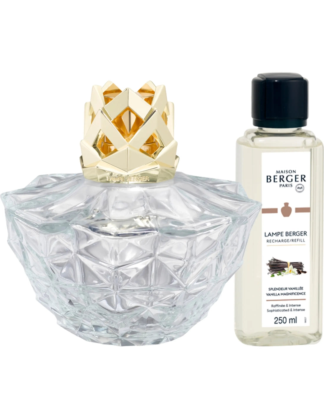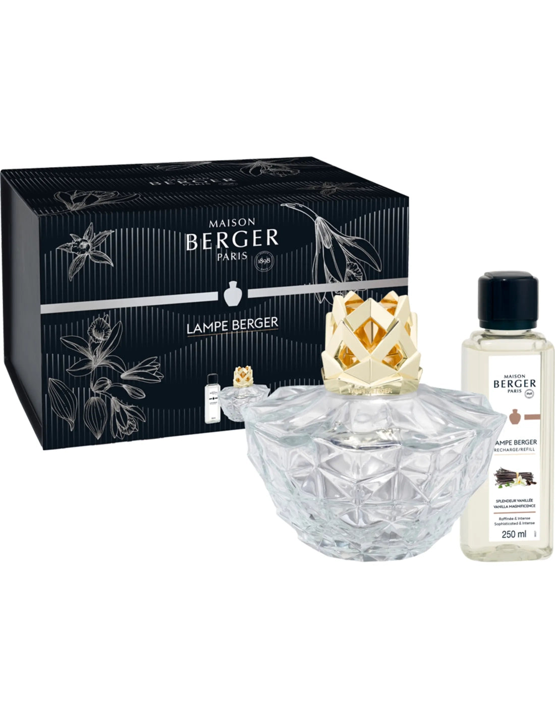 Maak kennis met de Lampe Berger Giftset Kali Transparente, een authentieke uiting van modern design, ontworpen door David Boulangé. De unieke, gefacetteerde, onregelmatige en asymmetrische vorm versterkt het licht en brengt een vleugje elegantie in uw interieur.