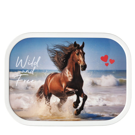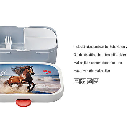 Kies voor variatie met de Mepal lunchbox Campus inclusief uitneembaar bentobakje en vrolijke Wild Horse print. De mogelijkheden voor een geweldige kinderlunch worden hierdoor bijna eindeloos. Zo kan je er natuurlijk vers brood in doen samen met heerlijk fruit. Of toch liever een hartig tussendoortje voor op school? Geen probleem! Geef ze gemakkelijk stukjes kaas, worst, noten of gedroogde vruchten mee in deze handige lunchbox. Zo kies en mix je de lekkerste snacks en blijft alles mooi gescheiden! Dankzij het bento bakje wordt de lunchbox in verschillende vakken opgedeeld. Zo blijft alles niet alleen goed liggen, het blijft ook veel verser. Natuurlijk kan je ook het bentobakje uit de lunchbox halen en er vier boterhammen in stoppen. Uiteraard mogen de lunchbox en het bentobakje na gebruik gewoon in de vaatwasser.