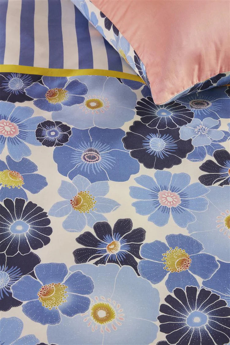 Dekbedovertrek Nica van Oilily geeft een kleurrijk tintje aan een moderne en trendy slaapkamer. Het ontwerp is geïnspireerd op oude sits-prints, maar in een modern jasje gestoken. De print, van aquarelbloemen in blauwtinten, met subtiele oker en peach accenten, heeft een vrolijke uitstraling. De frisse strepen aan de bovenzijde geven het overtrek een speelse twist. De achterzijde van dekbedovertrek Nica heeft een effen roze kleur.