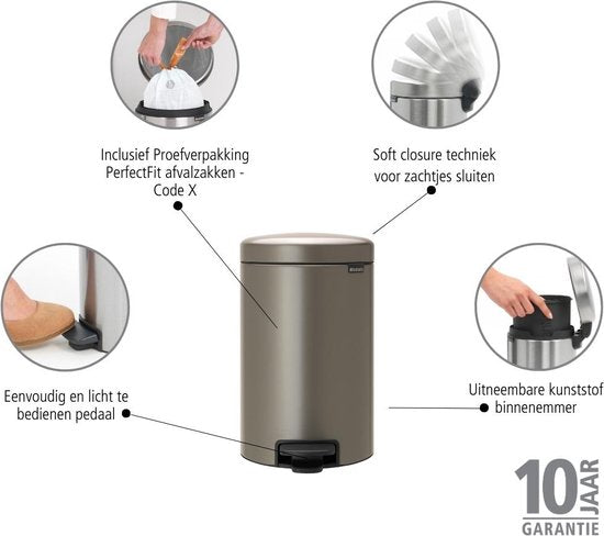 Een Brabantia Pedaalemmer NewIcon 12 liter is een prima manier om aan de slag te gaan met afvalmanagement. Klein genoeg om onder het aanrecht te verstoppen, stijlvol genoeg om in het zicht te zetten. Natuurlijk heeft ook deze hygiënische NewIcon afvalbak een geurdicht, zacht sluitend deksel en handig anti-kantelblok. Een stijlvolle toevoeging aan je thuiskantoor, hobbykamer of kinderkamer - of een andere kamer die wel een prima prullenbak kan gebruiken!