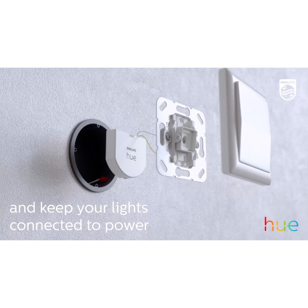 Monteer deze Philips Hue wandschakelaarmodule achter je gewone lichtschakelaar en bedien je slimme lampen gewoon zoals je gewend bent. Je lampen worden nooit per ongeluk helemaal uitgeschakeld en blijven altijd bereikbaar via de app. Je kunt de schakelaar zelfs gebruiken om je eigen scènes in te stellen voor afzonderlijke lampen, de hele kamer of een zone. Koppel de lampen die je wil gebruiken eenvoudig in de Hue app aan de wandschakelaarmodule. Om dit in te stellen is een Hue Brigde vereist.