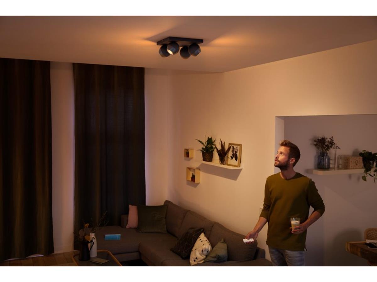 Met deze zwarte Philips Hue White Ambiance Buckram Spotbalk heb je vier lichtpunten voor het verlichten van de kamer. Elke GU10... Lees meer