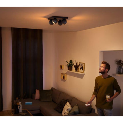 Met deze zwarte Philips Hue White Ambiance Buckram Spotbalk heb je vier lichtpunten voor het verlichten van de kamer. Elke GU10 LED lichtbron heeft een wattage van 5 Watt en is individueel af te stellen om de kamer uit te lichten. De lamp geeft warm- tot koelwit licht en is draadloos te bedienen met de meegeleverde dimmer switch of met de intuïtieve Hue app. Wanneer je de opbouwspot verbindt met de Hue Bridge, ontgrendel je alle slimme functies.