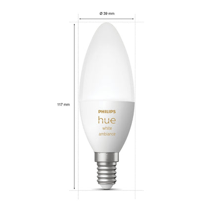 Met deze handige Philips Hue kaarslamp voeg je warm- tot koelwit licht toe aan iedere ruimte. De lamp heeft een E14 fitting en een kaars puntvorm. Bij deze lamp kun je je ontspannen of concentreren, lezen of energie opdoen. Bedien de lamp direct via Bluetooth of je stem, of koppel de lamp aan een Hue Bridge en ontgrendel alle slimme functies.
