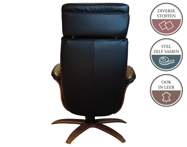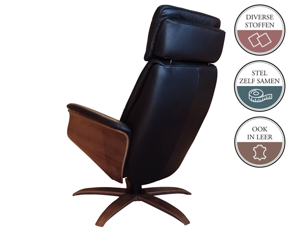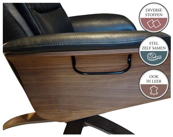 De houten zijkant is in diverse kleuren te bestellen. Het is ook mogelijk de houten zijkant mee te laten stofferen in dezelfde stof of leer keuze waarin je de relaxfauteuil bestelt. Je kunt de zijkant laten voorzien van een hendel, in het zwart of geborsteld. Uiteraard kan je de hendel ook achterwege laten.