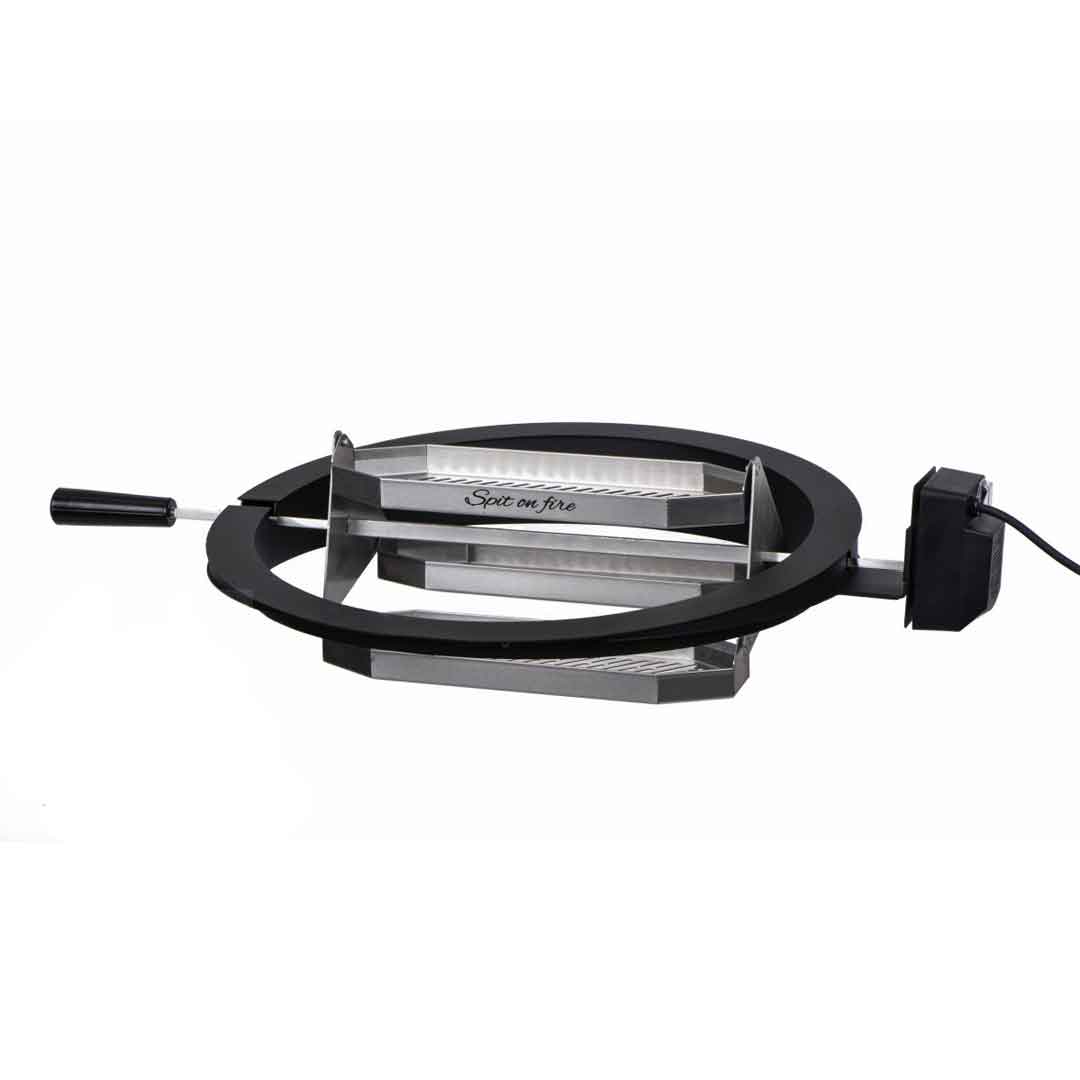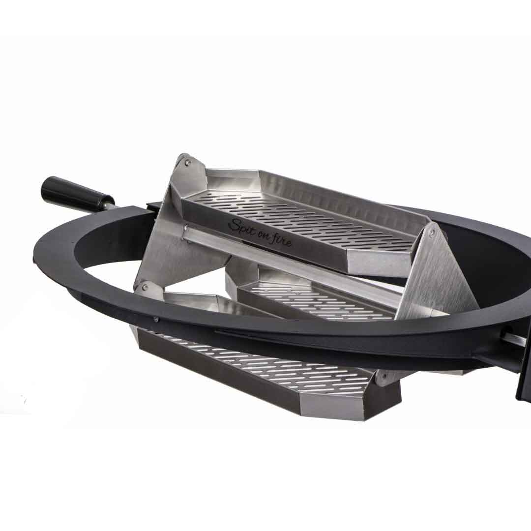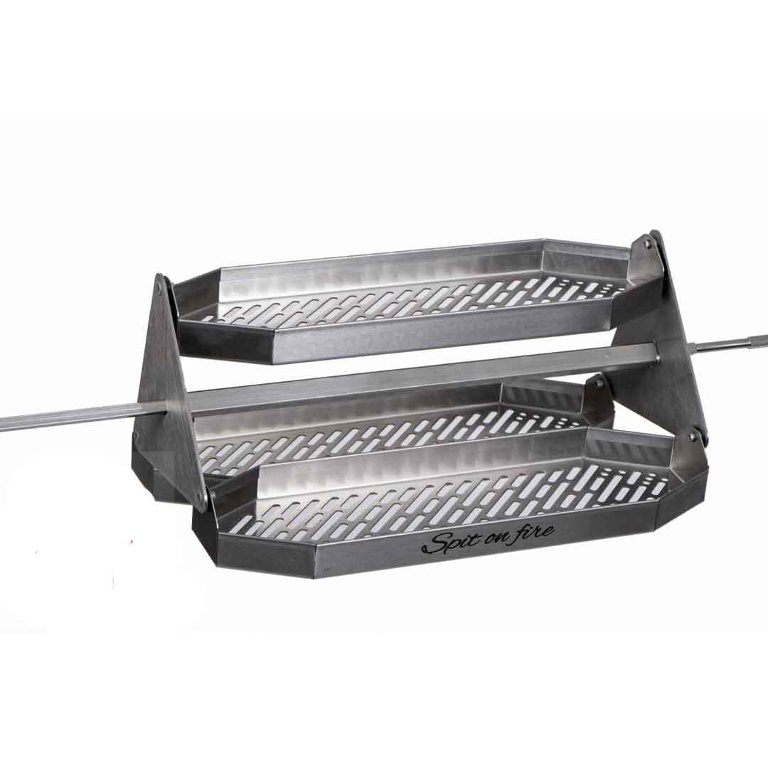 De Carrousel is gemaakt in een volledige RVS uitgevoerd en met zijn 3 manden een echte verrijking. Buikspek spareribs of gerookte zalm het kan allemaal. Mede door de roterende beweging die de manden krijgen binnen de gesloten barbecue. Hierdoor krijgt het eten een egale garing. Denk ook aan groenten, aardappel wedges, etc. Geschikt vanaf een medium maat, past op spits van The Spit on Fire, LetzQ en Joetisserie.