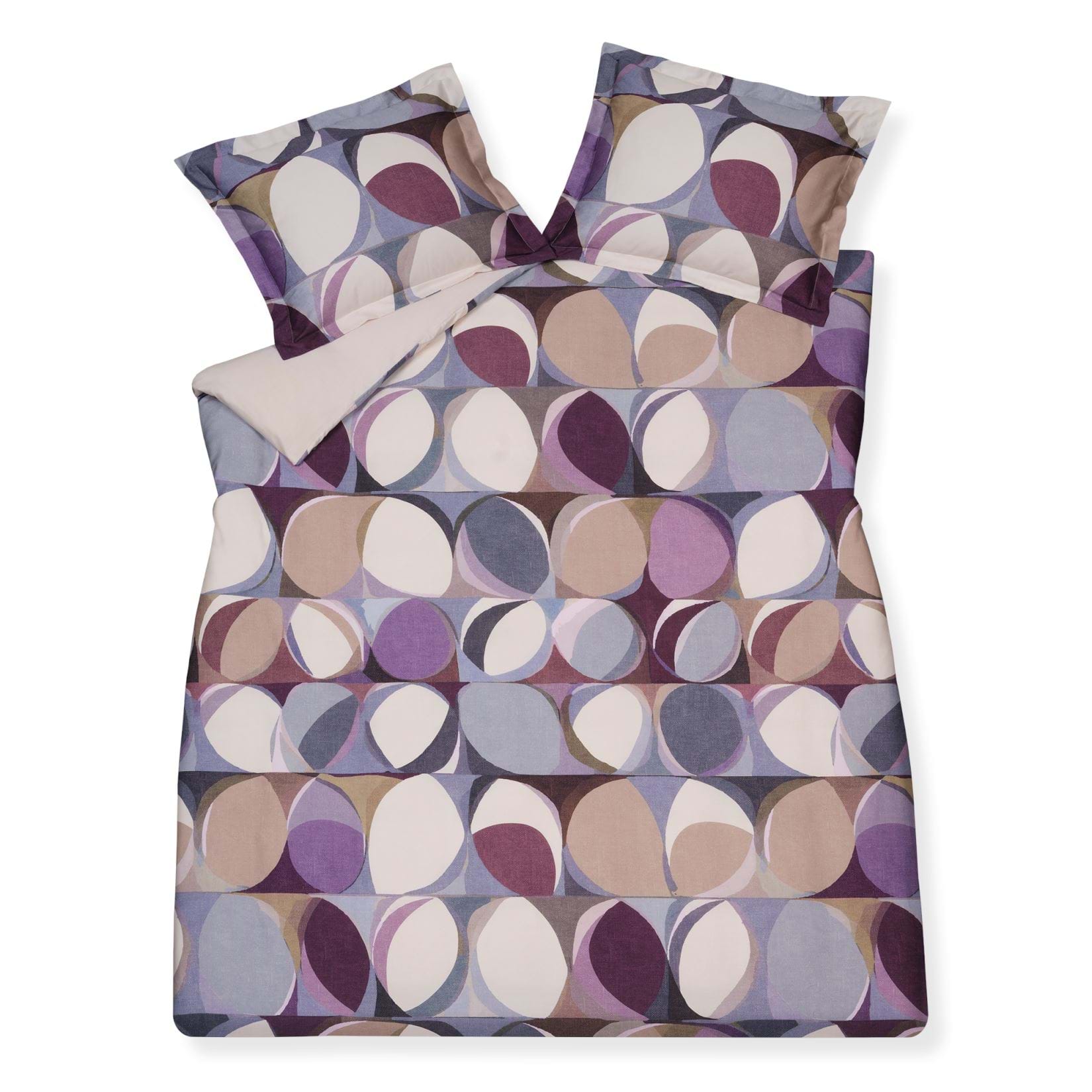 Orbit moonscape dekbedovertrek heeft vlakken met ronde vormen in verschillende tinten paars en blauw, waarbij het haast op verschillende standen van de maan lijkt. De achterkant van het dekbedovertrek is effen beige. De kussens hebben aan beide kanten een aantal vlakken met een brede rand. Orbit moonscape dekbedovertrek van Vandyck brengt je in een ander universum en laat je alles van verschillende kanten bekijken.